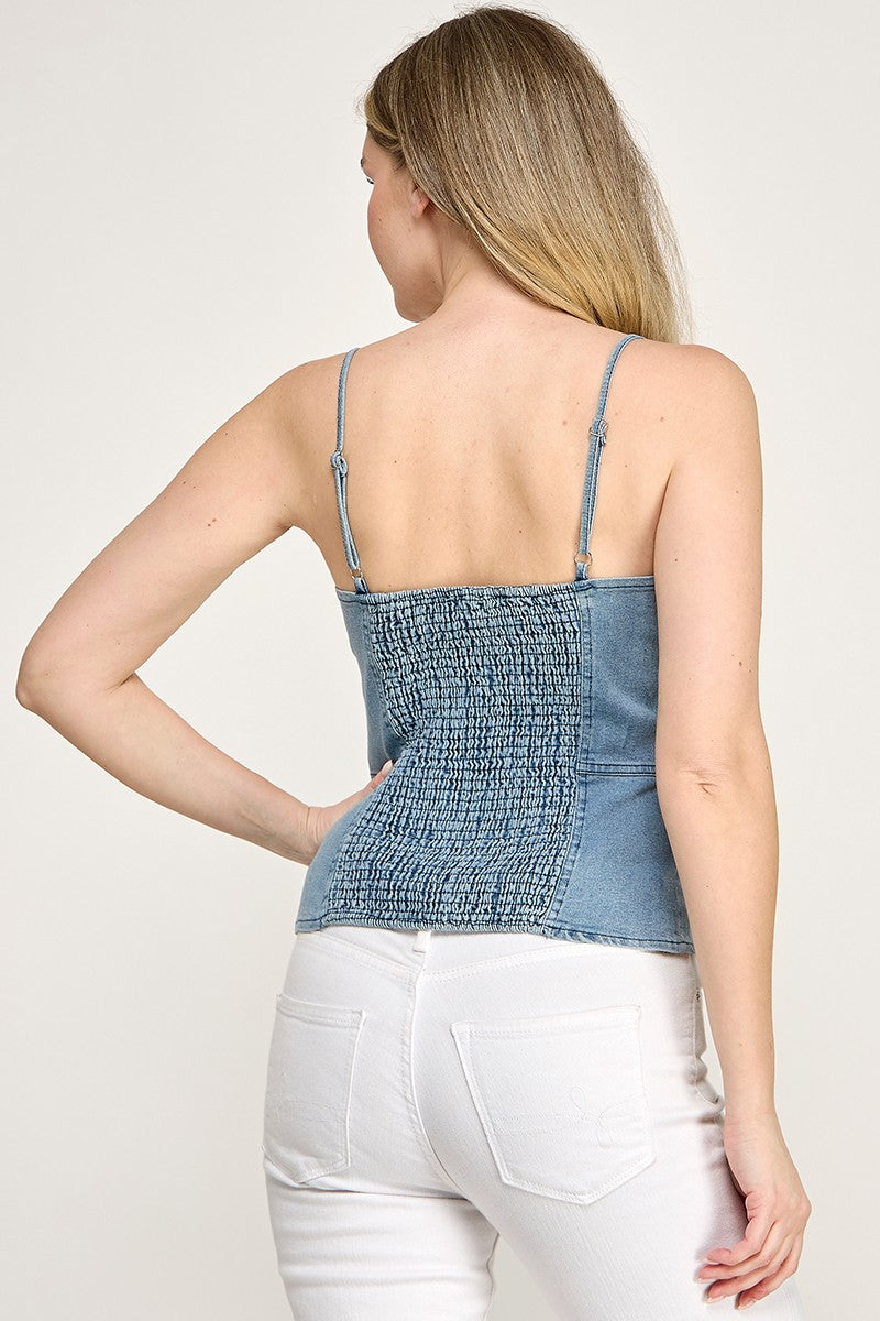 BLUE DENIM CAMISOL FEATURING WHITE FLORAL LACE BUTTON TOP W BACK SMOCKING
